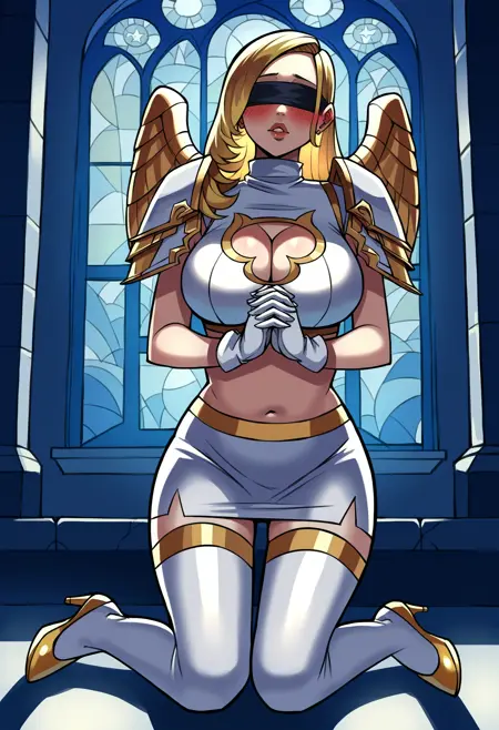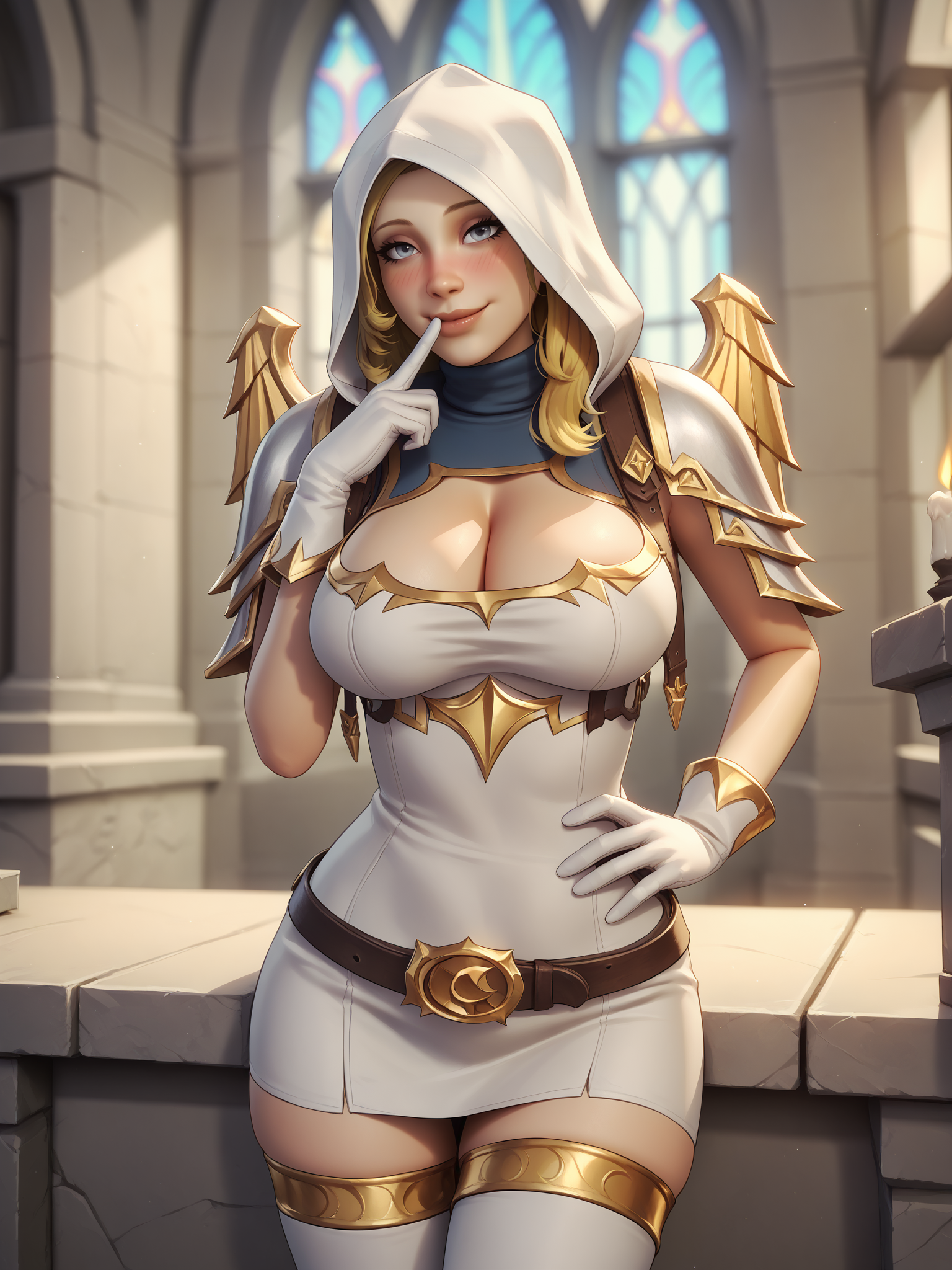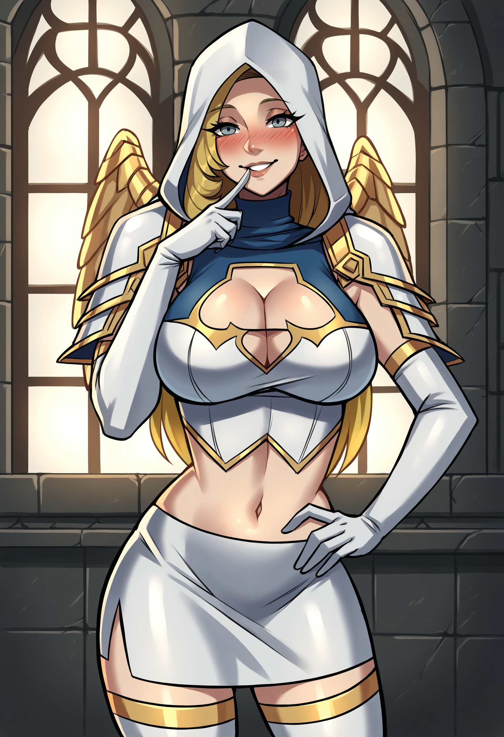 连帽衫, 带翼肩甲, 高领, 露脐上衣, 白色手套, 超短裙, 白色过膝袜, 胸部开叉设计,