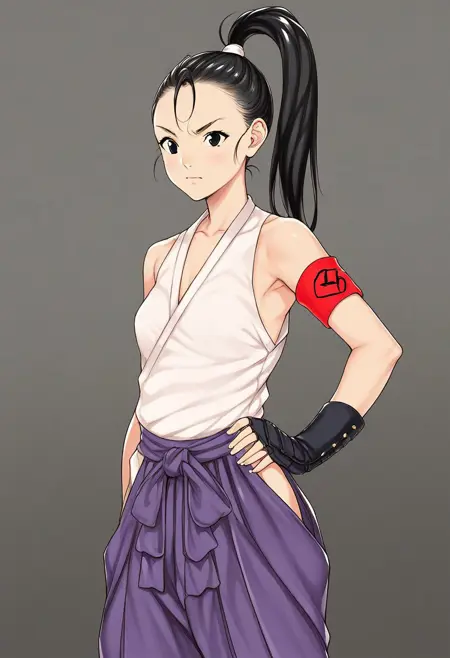 Tags: Kenshin Takeda, black hair, high ponytail, sharp bangs, stern expression, black eyes, small breasts,