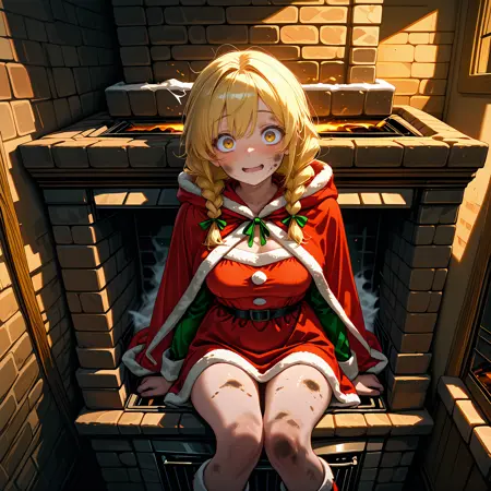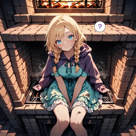トリガー: fathchg, 1girl, falling, dirty face, dirty clothes, sitting, in oven, chimney