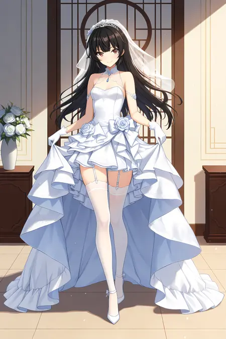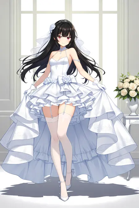 의상 태그 2: "weddingoutfit, dress, wedding dress, thighhighs, veil, white thighhighs, garter straps, gloves, white dress, bridal veil, white footwear, high heels,"
