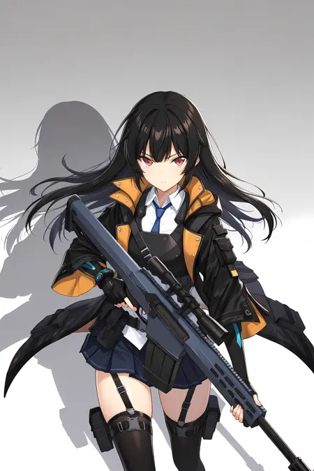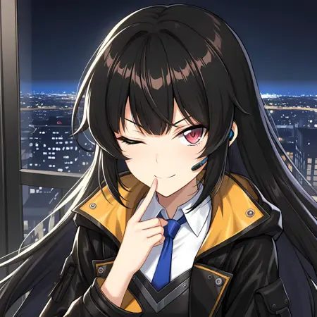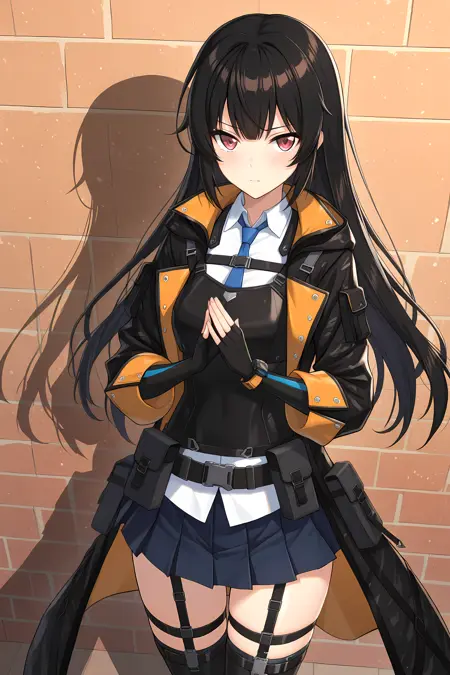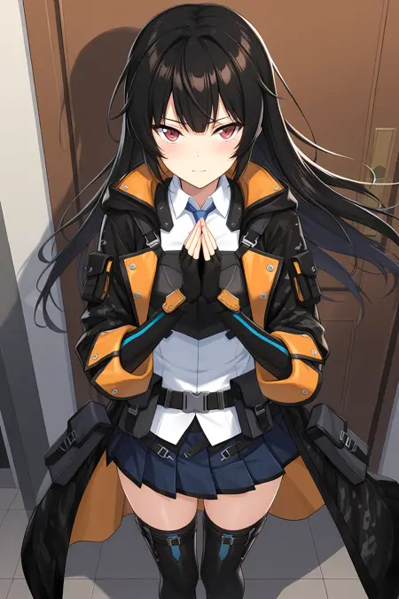 의상 태그 1: "defaultoutfit, gloves, necktie, skirt, fingerless gloves, black gloves, pleated skirt, thighhighs, jacket, white shirt, shirt, blue necktie,"