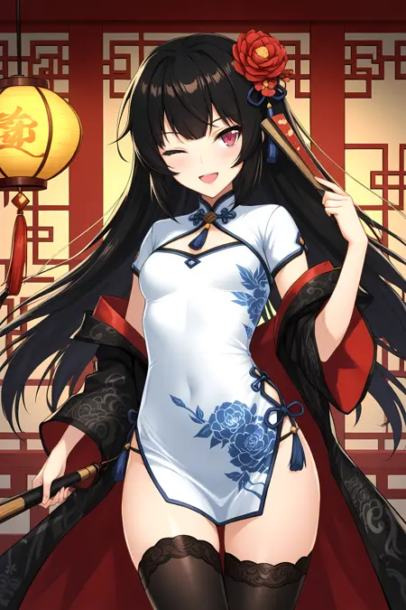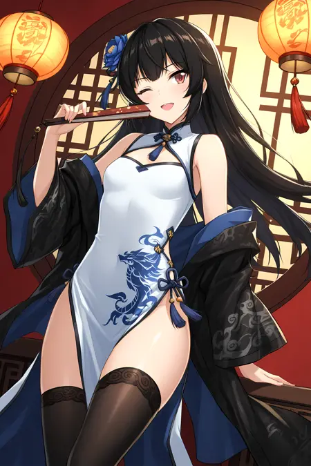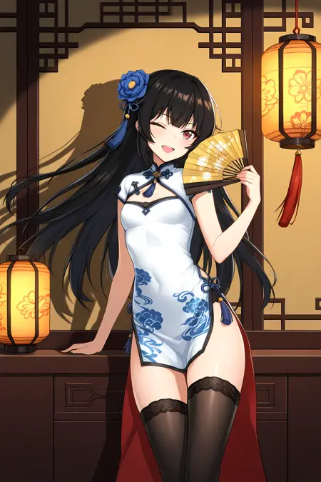의상 태그 3: "mysticalmoonlight, dress, thighhighs, hand fan, china dress, hair ornament, chinese clothes, lantern, hair flower, holding fan, folding fan, white footwear, white dress, black thighhighs,"