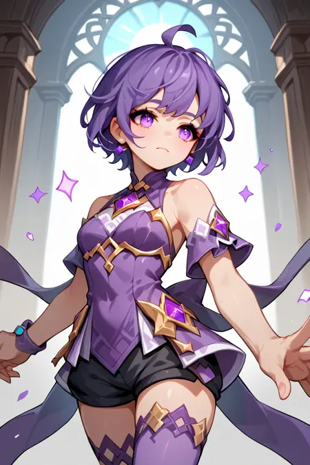 触发词:GCArme,紫色头发,紫色眼睛,短发,泡泡短裤,迷你裙,过膝长筒袜,魔法杖,魔法棒,巫师