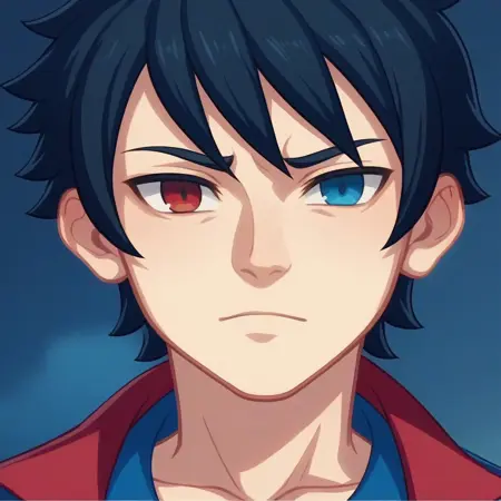 Aoi, black hair, heterochromia, red left eye, blue right eye, renegade garb, dark blue pants, toeless footwear,