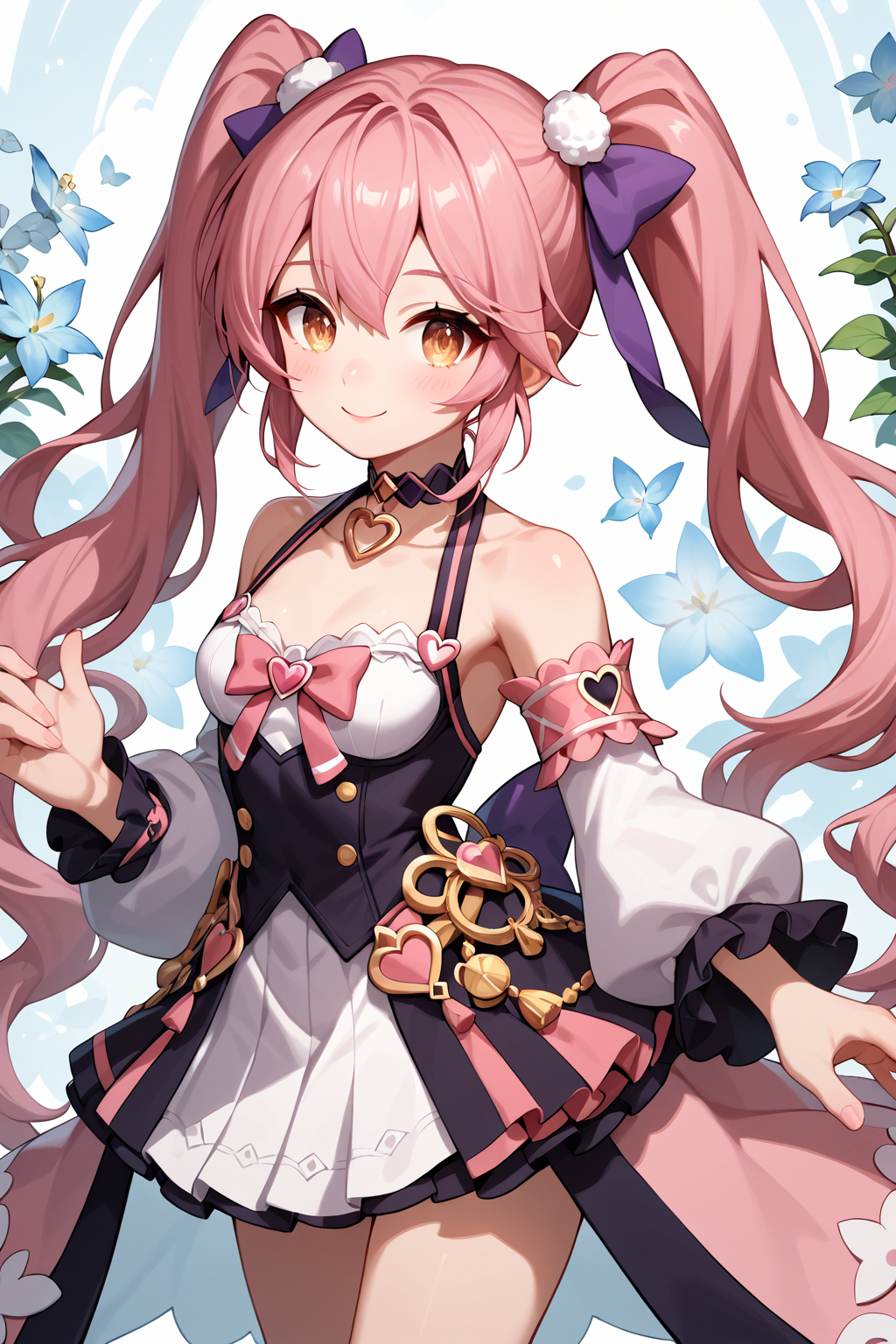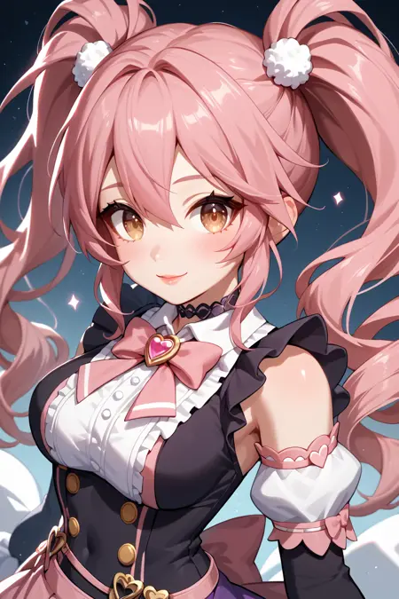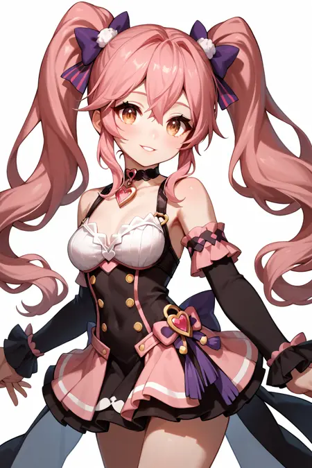触发词:GCAmy,粉发,浅棕色眼睛,双马尾,长发,偶像,短裙,脱袖,臂章,项圈,铃鼓,麦克风