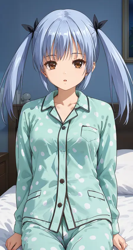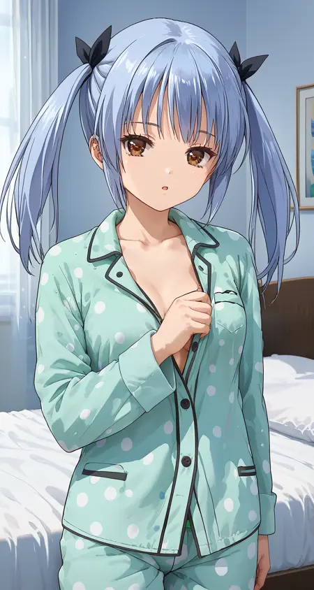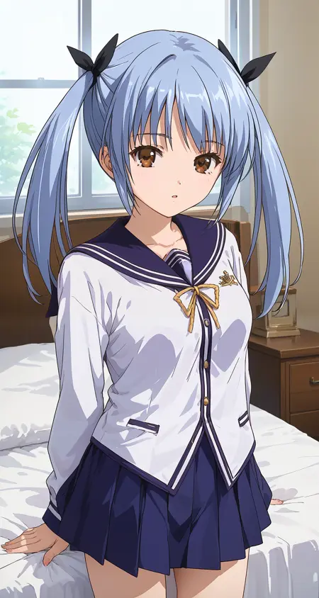 캐릭터: hyouka_kizaki, 파란색 머리, 트윈테일, 머리리본, 앞머리, 갈색 눈, 중간 크기의 가슴,