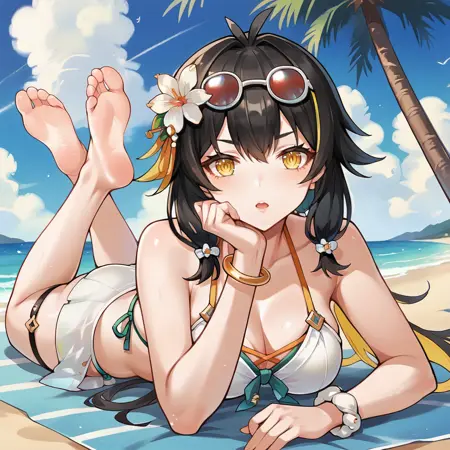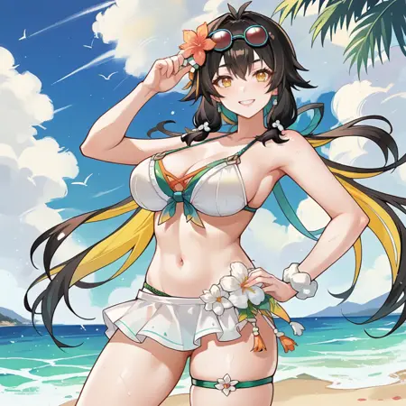 Jw_Swm, 두 줄기 땋은 머리, 머리꽃, 머리 위 안경, 선글라스, 팔찌, 손목 스러ン치, 흰색 꽃, 주황색 꽃, 비키니 스커트, 할터넥, 허벅지 스트랩,