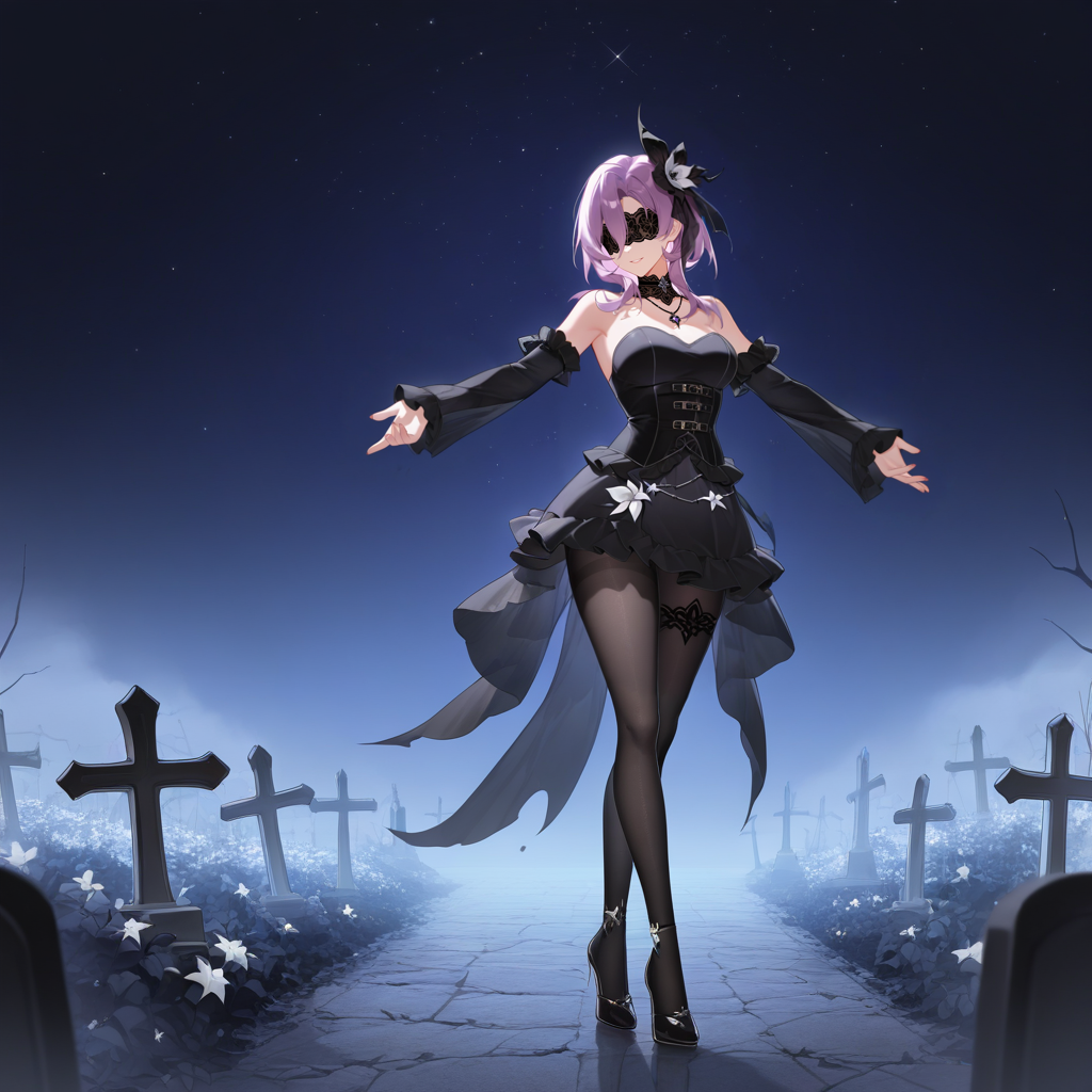 Frg_1st, 눈 가린 상태, 목가리개, 검은색 드레스, 짧은 드레스, 목걸이 없음, 헬터넥, 어깨 끈, 드러난 어깨, 흰색 코트, 코트, 분리형 소매, 짧은 퍼프 소매, 흰색 소매, 검은 장갑, 검은 팔 보호대, 허벅지 파우치,