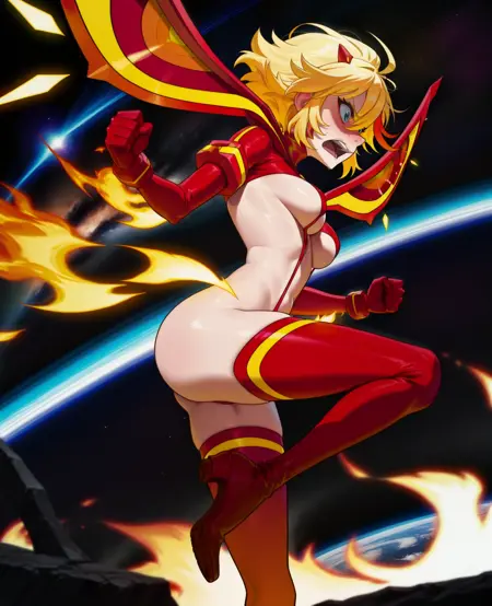 센케츠 키라사기: S3nk3tsuK1ra, 빨간 허벅지 긴 양말, 빨간 부츠, 유두 노출, 금발 머리, 빨간 옷 (외모 프롬프트에서 "검은 머리" 제거)