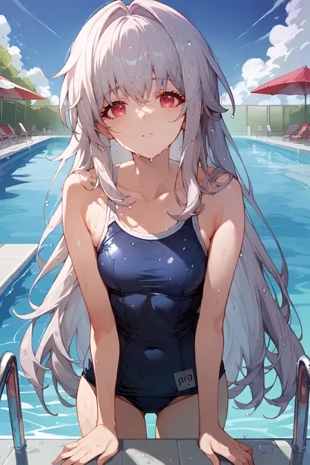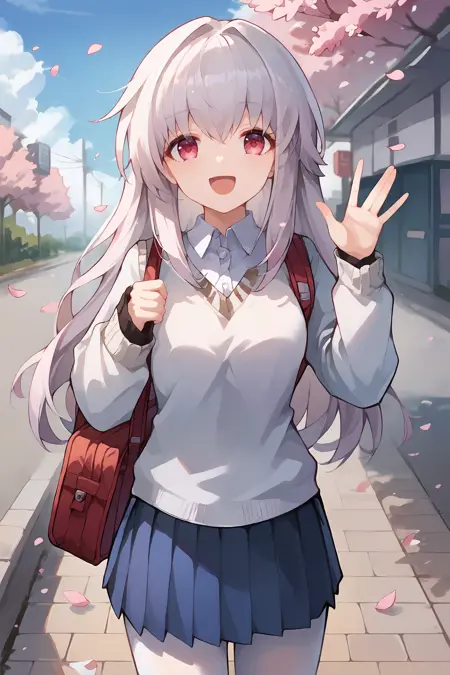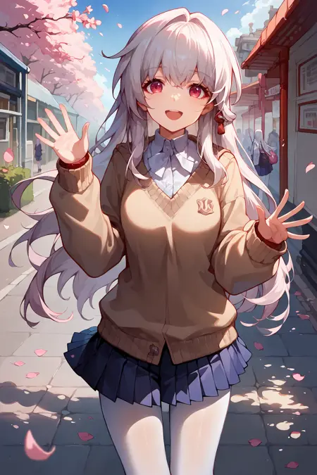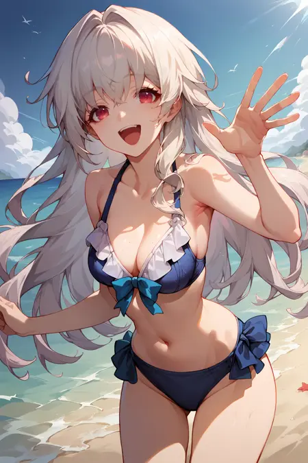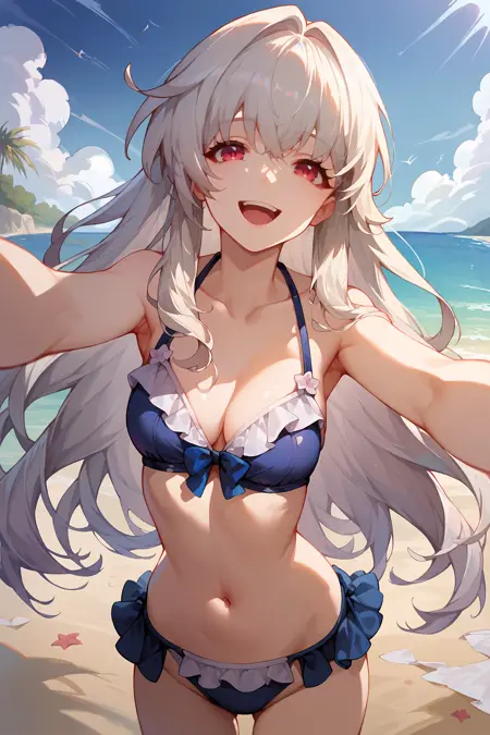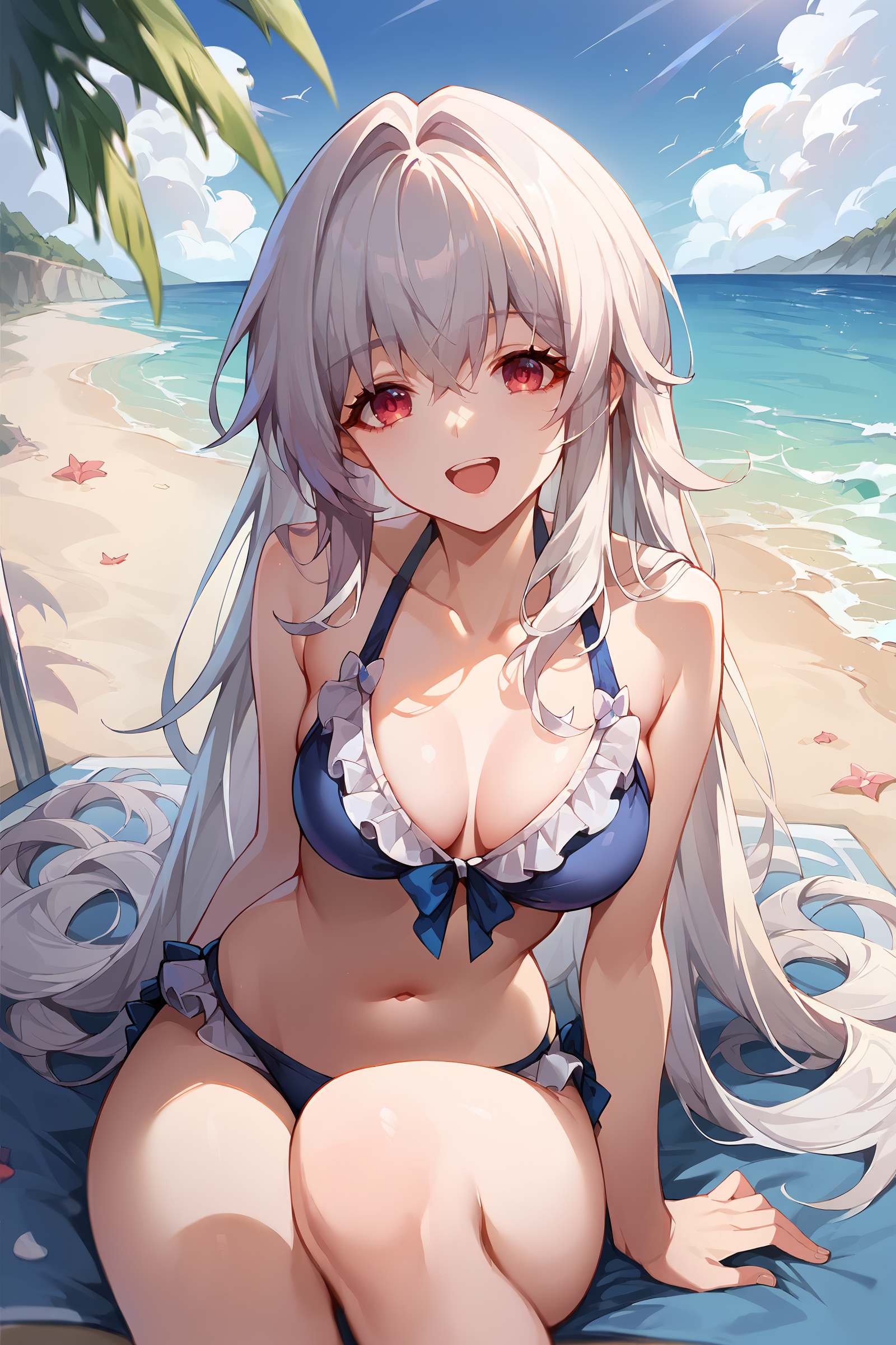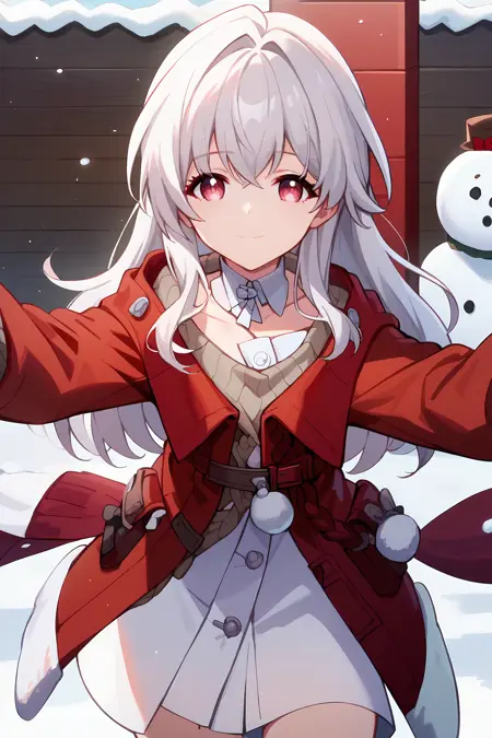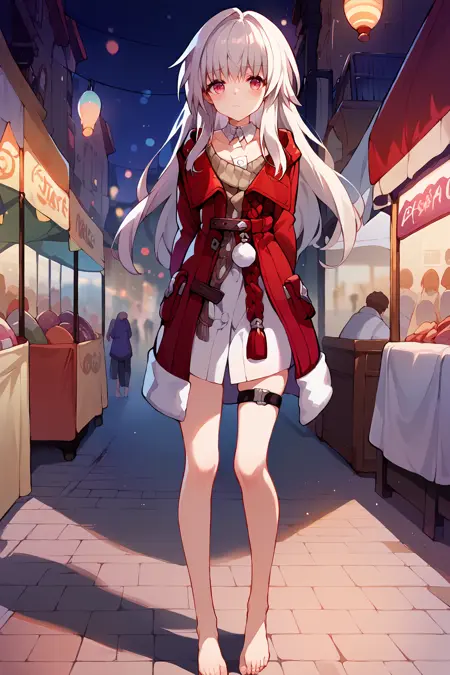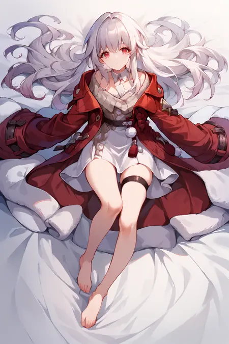 Additional prompts for her default in-game look: red coat, white dress, detached collar, sweater, barefoot, thigh strap