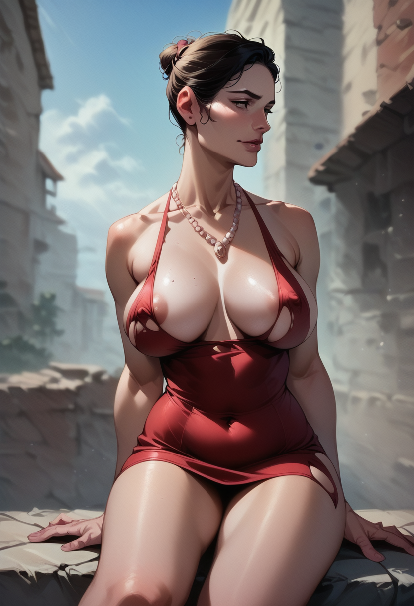 目を引くほど自信に満ちた女性。この成熟したキャラクターは、優雅さと魅惑を纏っている。彼女の真っ黒な髪は、滑らかで整った結い上げ髪となり、数本の繊細な髪が鋭く対称的な顔を縁取っている。彼女の鋭く深い暗い瞳には、知恵と神秘が込められ、控えめな微笑みは鋭い機知を示唆している。彼女は優雅な威厳をもって動き、あらゆる仕草が意図的で威圧的だ。洗練されながらも実用性を兼ね備えたシックなフィットした服を纏い、控えめだが確実に感じる官能性を放っている。彼女の態度は、知性と回復力、そして周囲の誰もを魅了する神秘的な魅力を持つ歴史を物語っている。