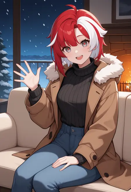 触发词 + 外貌: e1ka, 短发, 染发, 红发, 白发, 天线辫, 灰色眼睛, 红色瞳孔