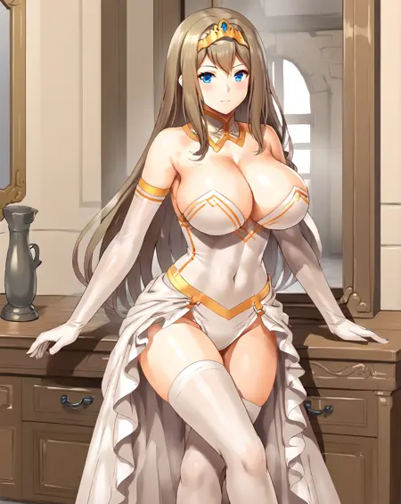 base prompt: princess_charlotte, 1girl, long hair, elbow gloves, brown hair, large breasts, tiara, blue eyes, white dress, bare shoulders, detached collar