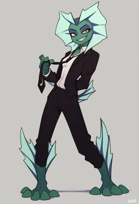 推奨ワード: "scalie、人間型、緑の肌、ヒレ、色付きの肌、ハゲ、頭部のヒレ、魚の女の子、黄色い目"