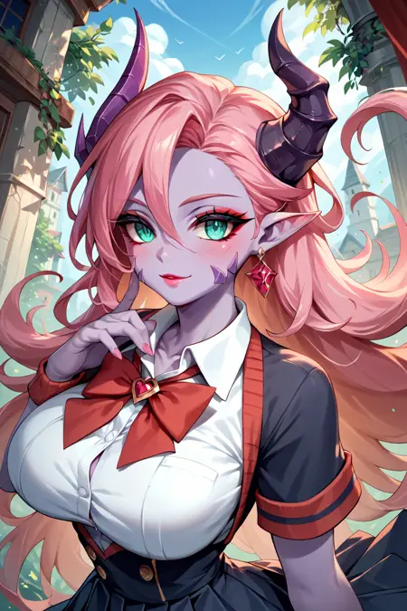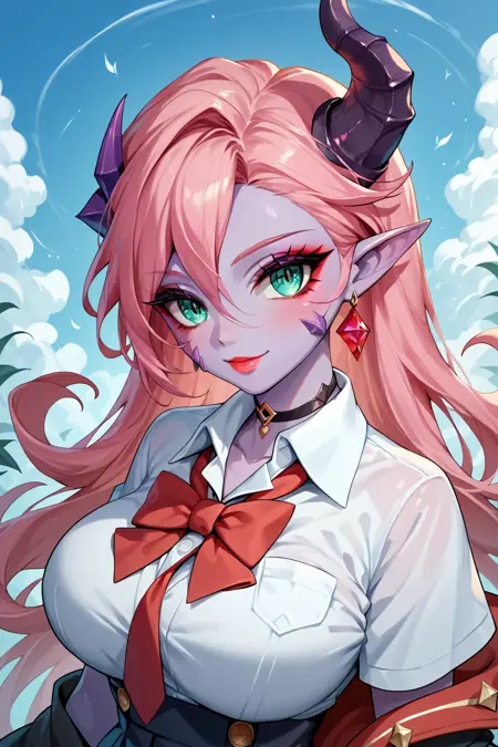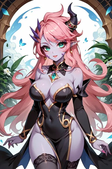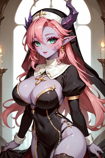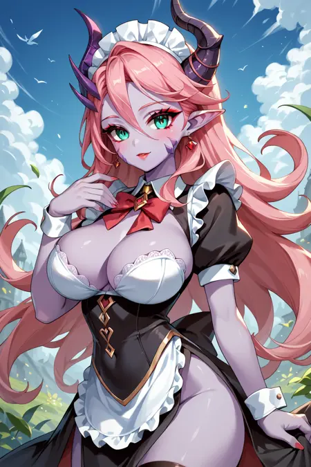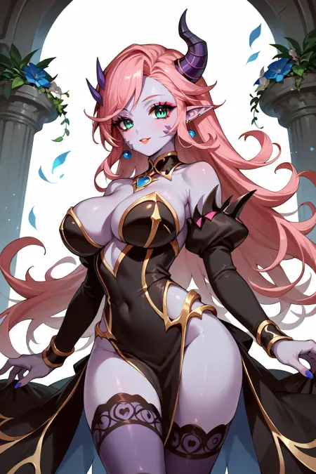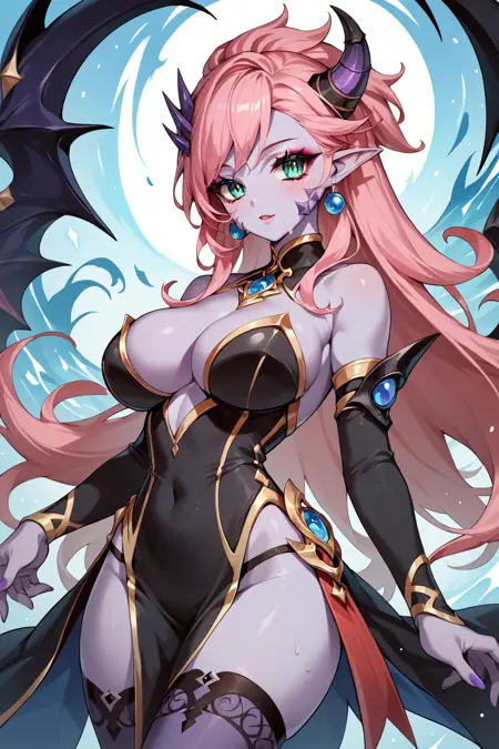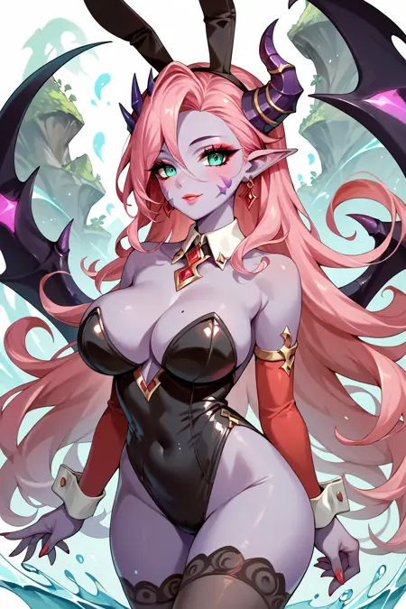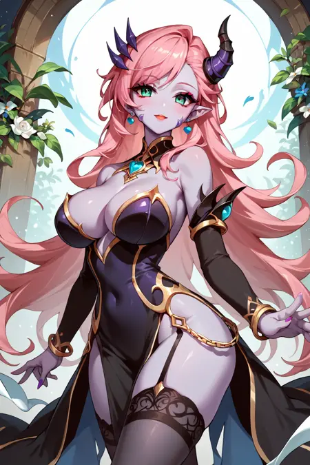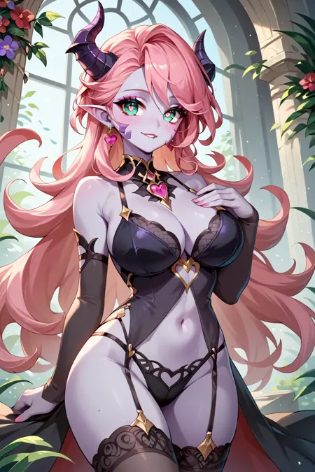 트리거: GCRey, 악마 소녀, 분홍색 머리카락, 보라색 피부, 청록색 눈, 뿔, 얼굴 무늬, 큰 가슴, 스타킹, 가터벨트, 메이크업