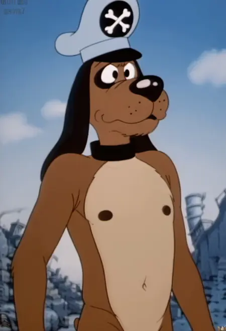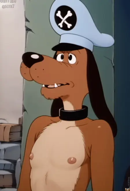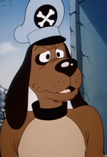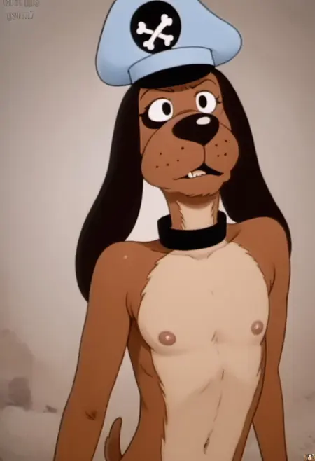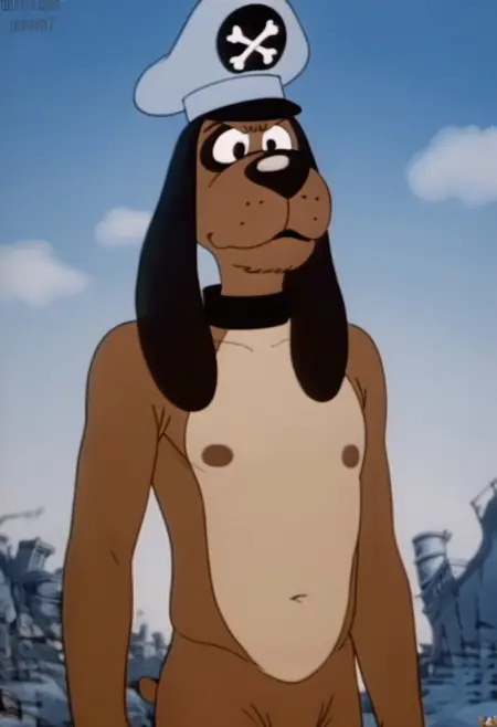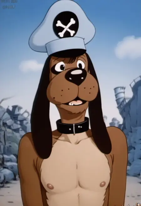 Leroy_CC, Leroy, Anthro Dog, Long snout, snaggle-toothed, brown fur, tan belly, dark-brown pads, docked tail, long ears, dog ears, floppy ears, black spot over right eye, shortstack, black eyes, black collar, light-blue hat, crossbones logo, service cap, peaked cap,
