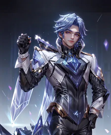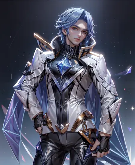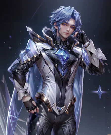 -Sample prompt: (a boy) ,Florentino, solo, smile, short hair, gloves, long sleeves, blue hair, jacket, focus, black gloves, pants, fingerless gloves, glowing, gem, ((black bearded)) , (universe), stars, (blue glow), BREAK galaxy,looking at viewer, closed mouth, blue hair, standing, full body, boots, cape armor