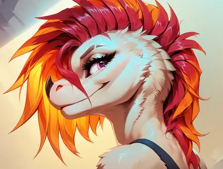source_furry, raptor, anthro, fluffy white fur texture, tan underbelly, nose horn, mohawk, red hair with orange highlights, kabg0th, black hair with red highlights,