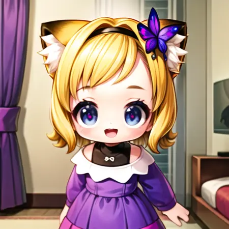 옷: 보라색 드레스, 헤어밴드, 나비 모양 머리 장식