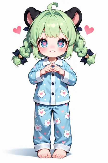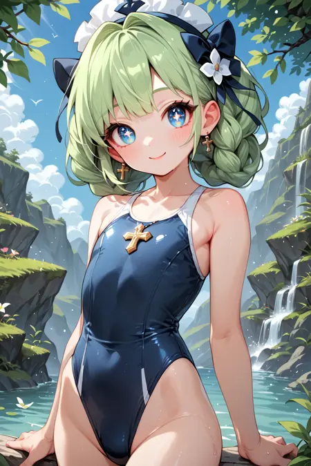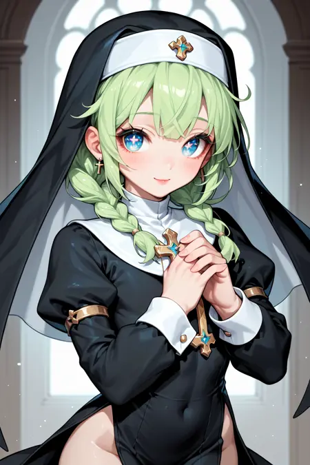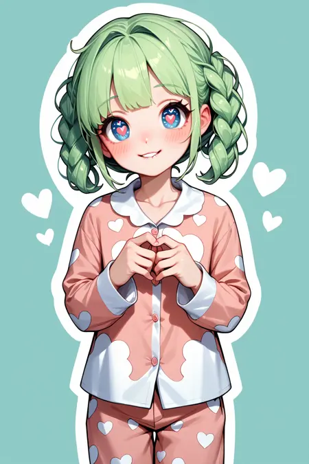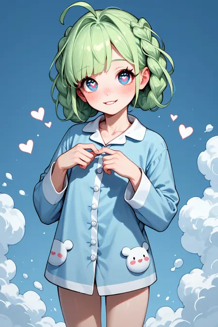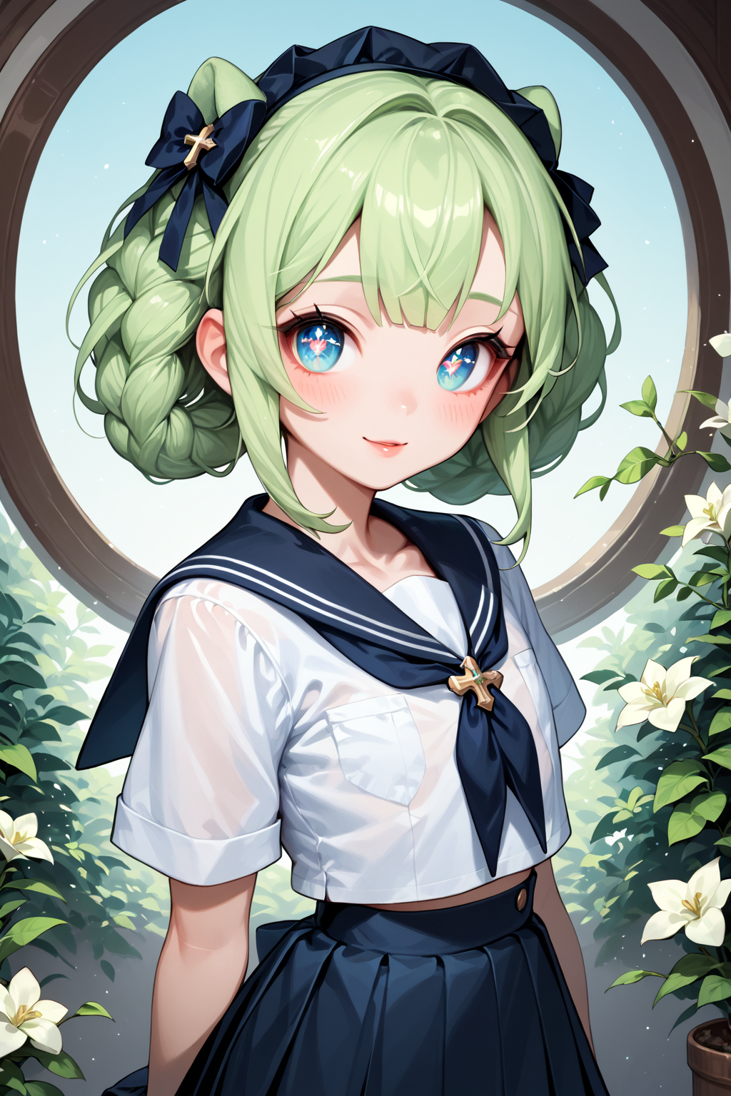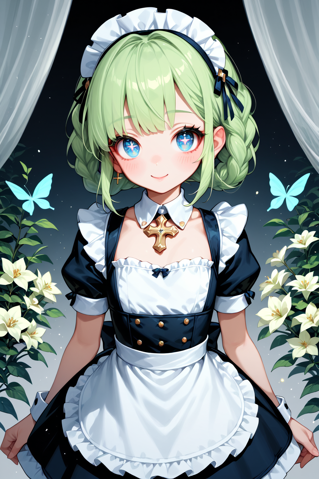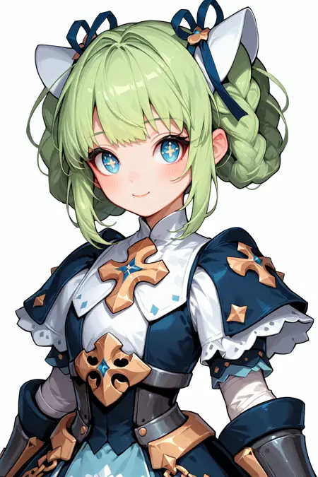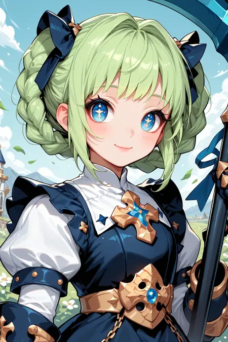 トリガー: GCLime, + +, 交差した瞳、薄緑の髪、青い目、ミルメイドの編み込み、編み込み、鎧のドレス、鎧のブーツ、青いリボン、ガントレット、太ももブーツ、戦鎚、巨大なハンマー