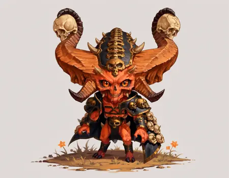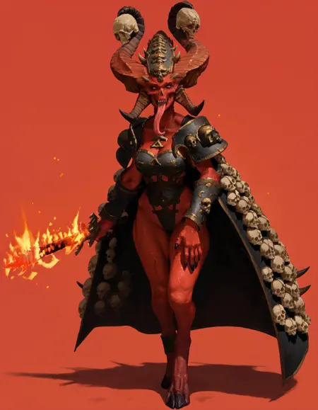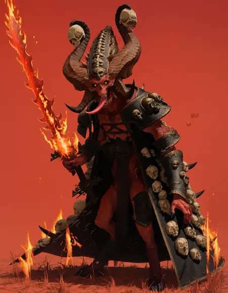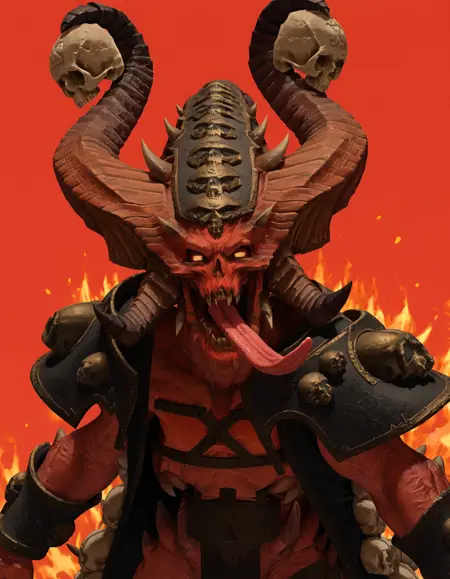 Skulltaker, monster, horns, armor, skull cape, orange eyes, black sclera,
