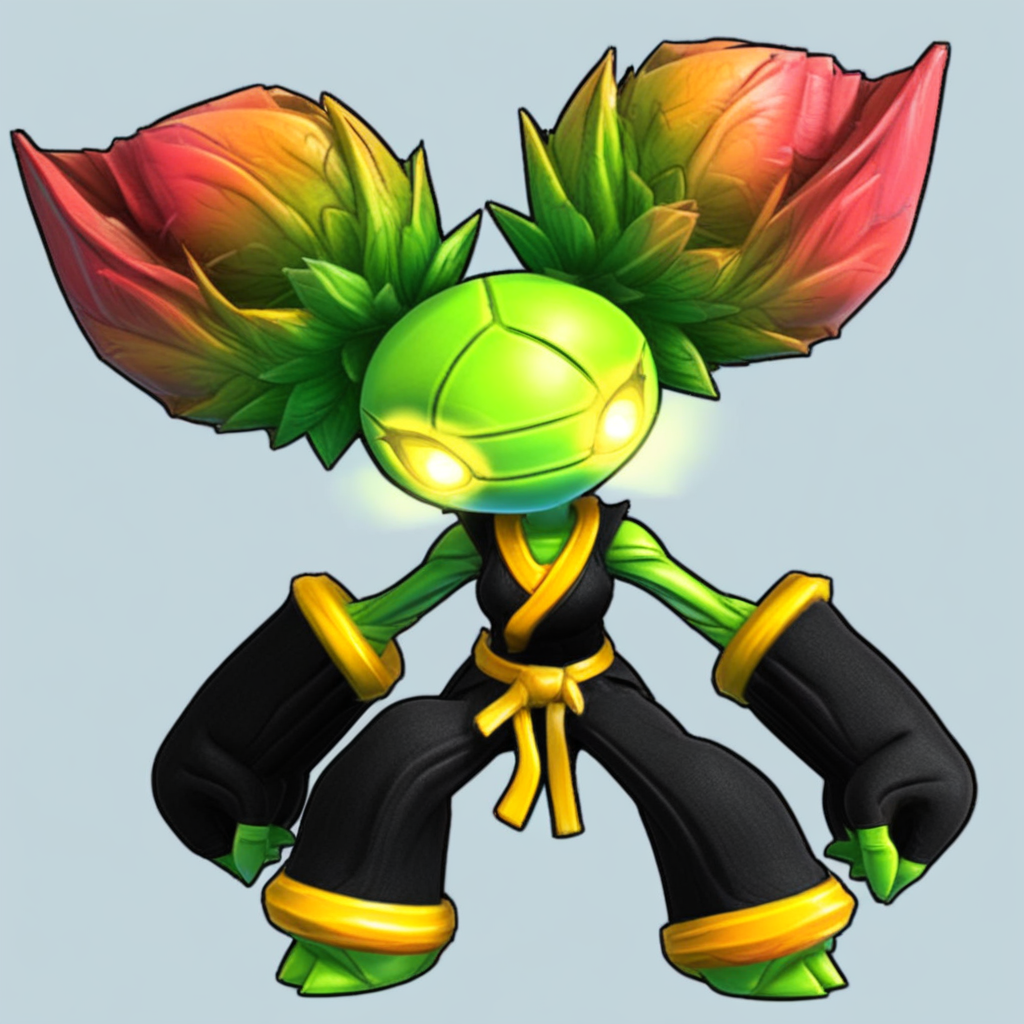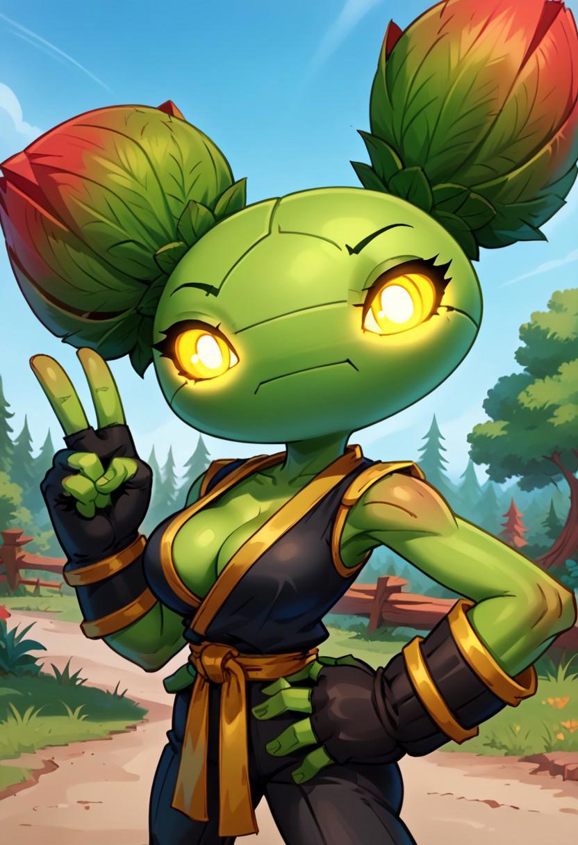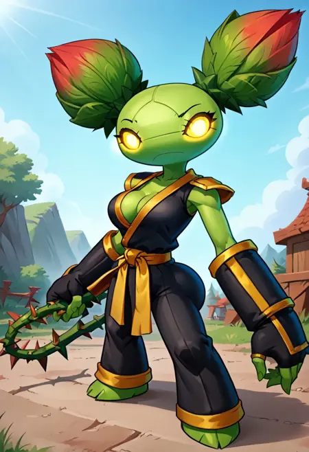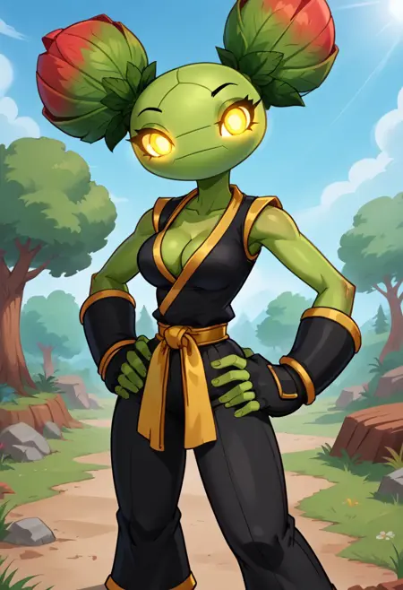 1人の女の子、人間なし、植物女性、植物人間、スカイランダーズ、色付きの肌、緑の肌、緑の肌をした女性、口なし、鼻なし、黄色い目、瞳孔なし、発光する目、黒い手袋、指なし手袋、結び目のあるベルト、黄色いベルト、武術のユニフォーム、ノースリーブ、黒いユニフォーム、黄色いトリム、Vネック