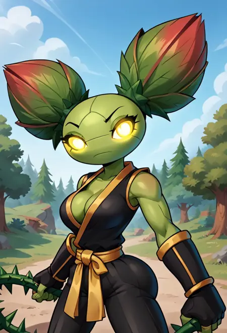 1个女孩,无人类,植物女性,植物人,Skylanders,彩色皮肤,绿色皮肤,绿皮肤女性,无嘴,无鼻子,黄眼睛,无瞳孔,发光眼睛,黑色手套,露指手套,系带,黄色腰带,武术服,无袖,黑色服装,黄色镶边,V领