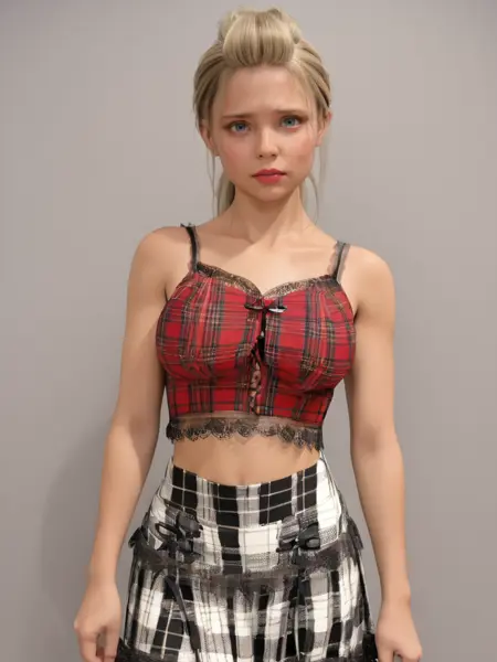 黒いチョーカー、白い前開きのキャミソール、キャミソールの下の黒いブラ、胸元、短い袖、お腹部分、チェックのミニスカート、赤いミニスカート、白い太ももハイ、へそピアス、ハート型のへそピアス