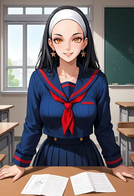 黒髪、オレンジ色の目、ヘアバンド、唇