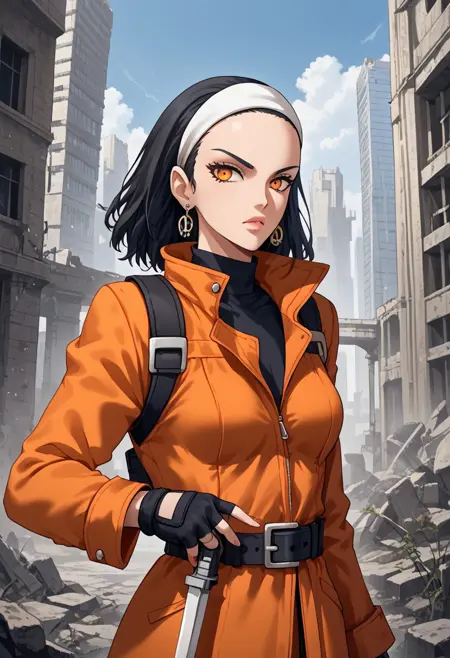 black hair,black gloves,boots,fingerless gloves,knee pads,orange jacket,earrings, belt,lips,orange eyes,hairband,
