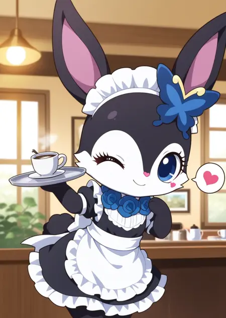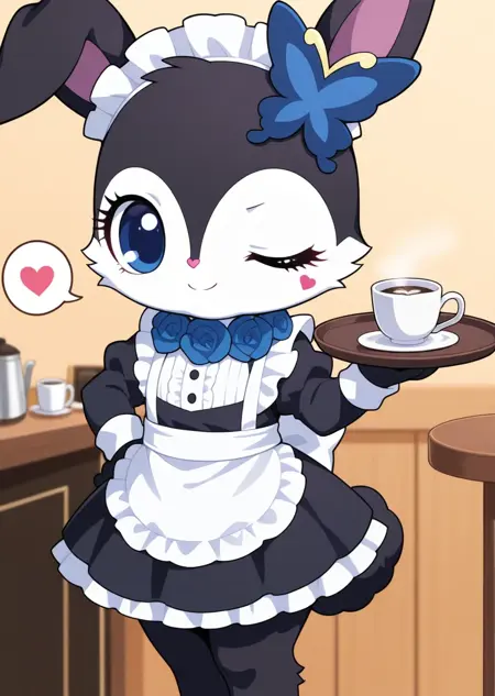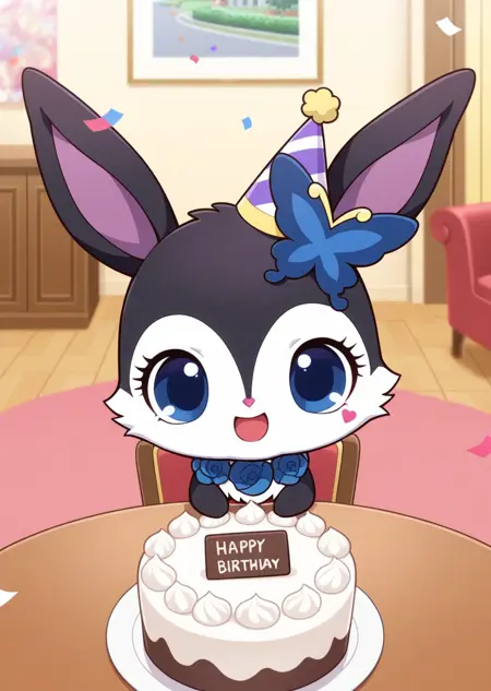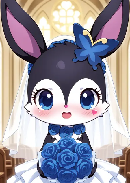 提示词:luea, 蓝眼睛, 毛茸茸, 兔子耳朵, 兔子, 黑色毛发, 蓝玫瑰项链, 蝴蝶发饰, 紫色耳内, 白色胸毛, 白色脸部, Q版,