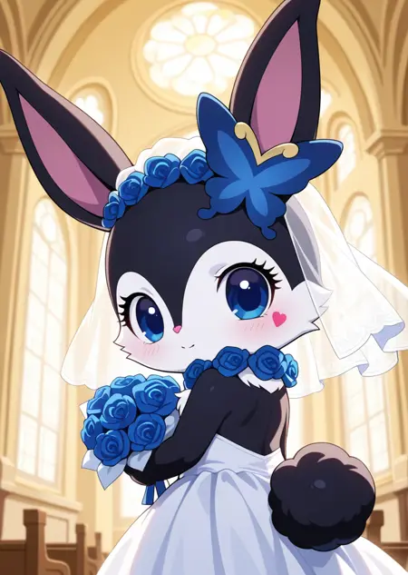 프롬프트: luea, 파란 눈, 풀리, 토끼 귀, 토끼, 검은 털, 파란 장미 목걸이, 나비 모양 머리 장식, 보라색 귀 안쪽, 흰색 가슴 털, 흰색 얼굴, 치비,