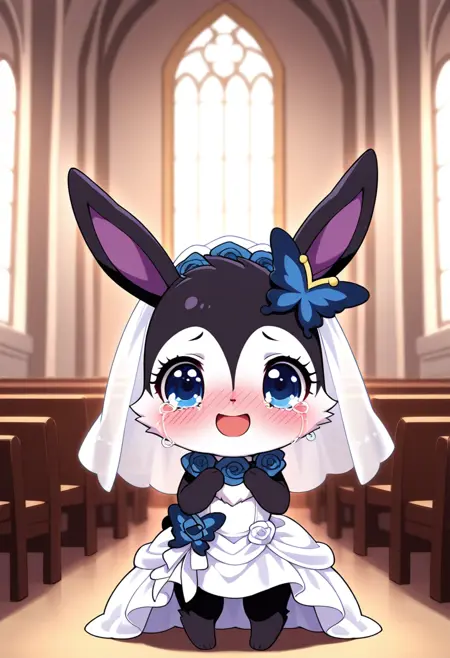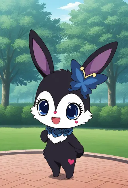 prompts: luea, blue eyes, furry, rabbit ears, rabbit, black fur, blue rose necklace, butterfly hair ornament, purple inner ear, white chest fur, white face, chibi,