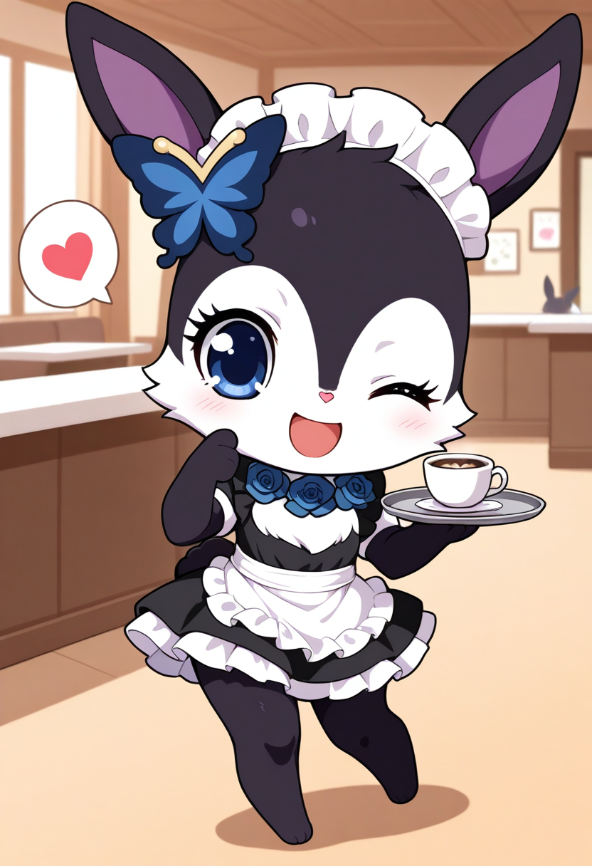 Prompts: luea, feral, furry, white chest fur, butterfly hair ornament, blue rose necklace, 1girl, looking at viewer, red heart cheek tattoo, red heart hip tattoo, black fur, chibi,