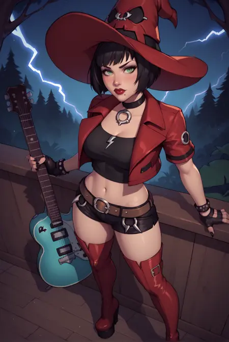 | 训练词汇 | short hair, green eyes, bob cut, black hair, mole above mouth已复制! red short dress, detached sleeves, cleavage, bare shoulders, no bra, choker, makeup, red witch hat, red thigh boots, lipstick, o-ring, leather, platform boots已复制! makeup, red witch hat, red jacket, short sleeves, choker, brown belt, loose belt, midriff, fingerless gloves, crop top, short shorts, red thigh boots, platform boots, lipstick已复制! |