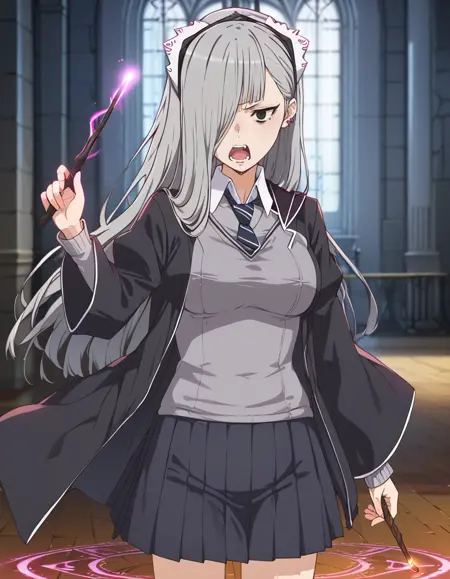 <lora:horn-danmachi_s5-anime-soralz:1>, 角(丹莫奇 S5),长发,灰发,女仆头饰,头发遮住一只眼睛,黑眼睛,耳环,首饰
