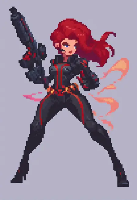 • Useful keywords: red hair, asymmetrical hair, headset microphone, eyeliner, blue eyes, red lips, bodysuit, black bodysuit, gloves, black gloves, forearm guns, black clothes, red nail polish, red details, red glow, high heels, baton_(weapon), holding weapon, sniper rifle, holding sniper rifle, huge weapon