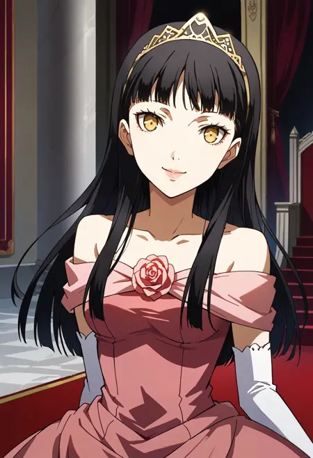 p4yukiko-shadow, yellow eyes, tiara, ballgown, pink ballgown, pink dress, bare shoulders, flower, rose, red rose, elbow gloves,