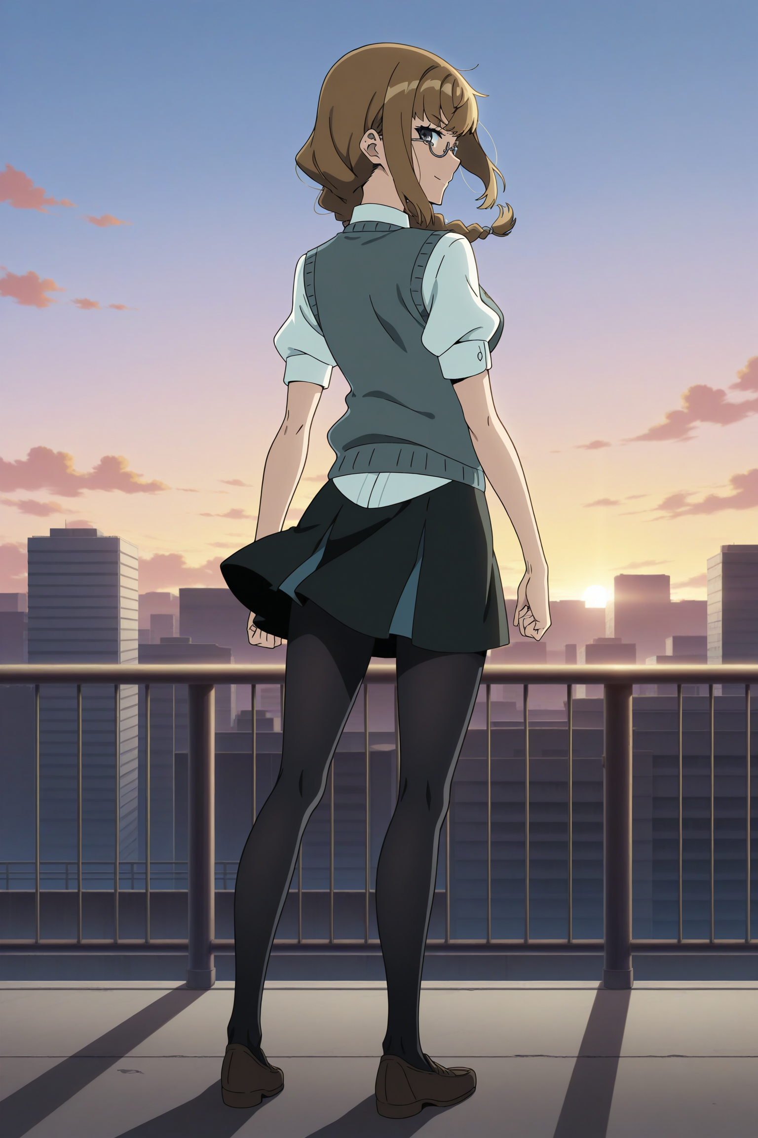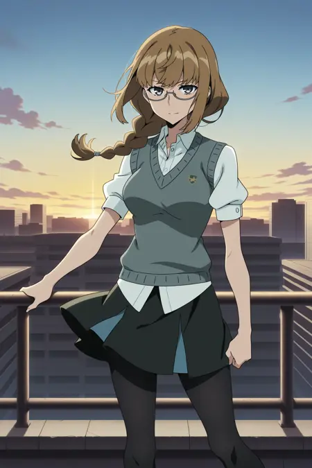 maki honoka, long hair, brown hair, braid, braided ponytail, sidelocks, grey eyes, semi-rimless eyewear, school uniform, short sleeves, white shirt, collared shirt, untucked shirt, grey sweater, sweater vest, black skirt, pleated skirt, black pantyhose, brown lorafers