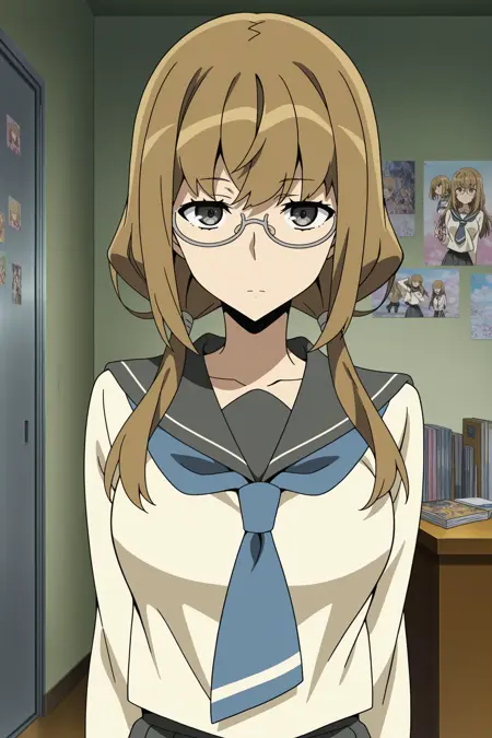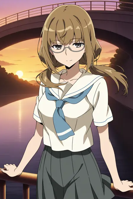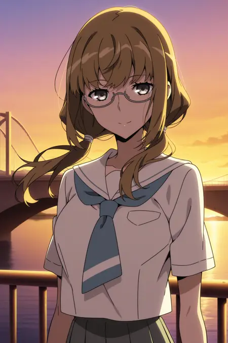 maki honoka, long hair, brown hair, twintails, white hairtie, sidelocks, grey eyes, semi-rimless eyewear, serafuku, short sleeves, white shirt, white sailor collar, blue neckerchief, grey skirt, pleated skirt
