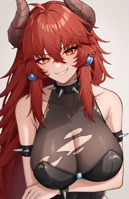 General Appearence Prompt: leotard, black leotard, strapless leotard, armlet, bodysuit, breasts, cleavage, cosplay, dragon tail, red tail, dragon horns, horns, large breasts, spiked armlet, horns, long hair, red hair, red eyes, torn clothes, torn bodysuit, torn clothes, earrings, chain belt, spiked choker, single detached sleeve