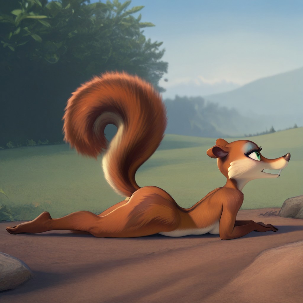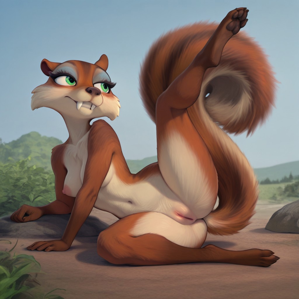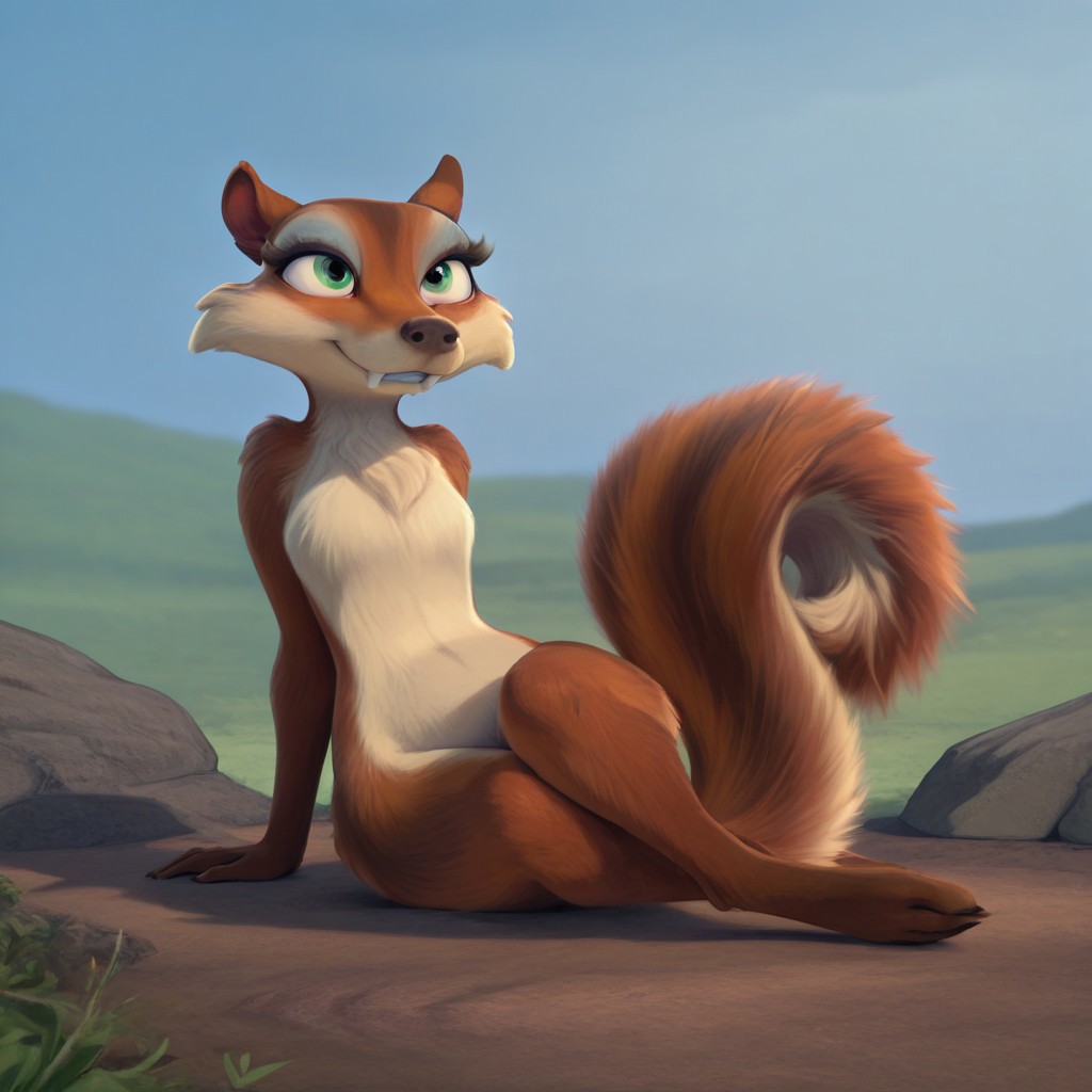 Scrattedotdil, feral, female, squirrel, orange-brown fur, green eyes, blue eyeshadow, saber tooth