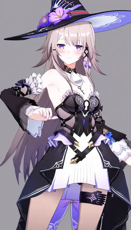 如果您认为模型对服装细节的还原度不够,可添加提示词如“key necklace”、“keyhole on chest”、“leg ring”、“nail polish”,这些是我针对大黑塔独特的服装特点,在训练时额外添加的标注。(包括钥匙形状的项链、胸口锁孔状镂空、腿环、紫色指甲油)
