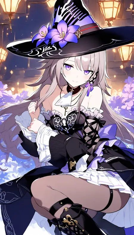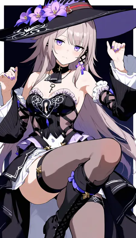 (best quality,8K, masterpiece ,simple flat background, clear background,none background),mihoyo,1girl, solo, hat, long hair, detached sleeves, jewelry, dress, witch hat, earrings, flower, bangs, hat flower, necklace,key,bare shoulders, black dress, black footwear,frilled sleeves, black headwear, grey hair, frills, long sleeves,cross, purple flower,stockings,boots,knee boots