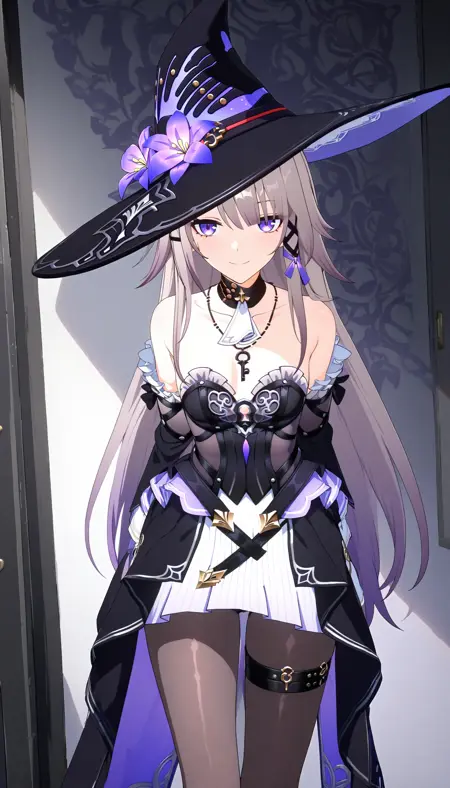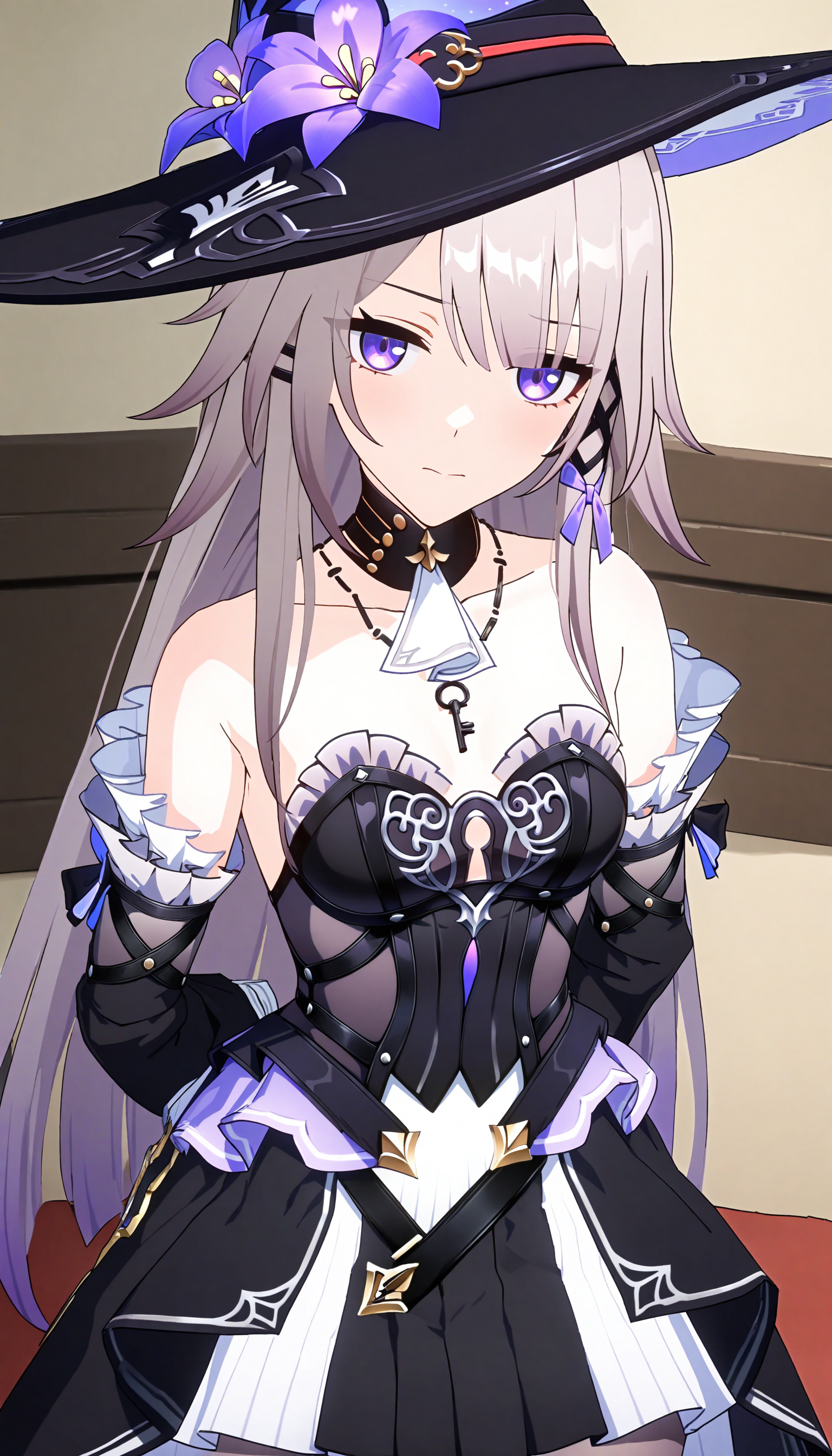 (best quality,8K, masterpiece ,simple flat background, clear background,none background),mihoyo,1girl, solo, hat, long hair, detached sleeves, jewelry, dress, witch hat, earrings, flower, bangs, hat flower, necklace,key,bare shoulders, black dress, black footwear,frilled sleeves, black headwear, grey hair, frills, long sleeves,cross, purple flower,stockings,boots,knee boots
