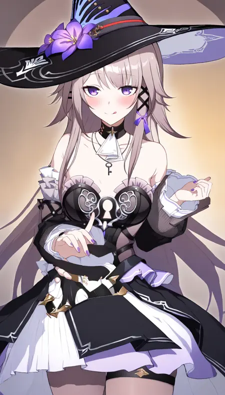 모델이 의상 세부 사항을 충분히 재현하지 못한다고 생각되면 "key necklace", "keyhole on chest", "leg ring", "nail polish" 같은 프롬프트를 추가해 보세요. 이는 제가 대흑탑의 독특한 의상 특징을 반영하기 위해 학습 시 추가로 캡션에 포함한 내용입니다. (키 모양의 목걸이, 가슴부분의 열쇠 구멍 형태의 빈공간, 다리 고리, 보라색 네일 폴리시)