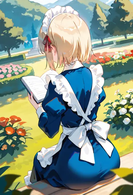 1girl, mugetsu, 戴蓝色丝带的女仆头饰,黄眼睛,蝴蝶结,女仆,金发,红色丝带,短发,蓬松袖子,围裙,蓝色连衣裙