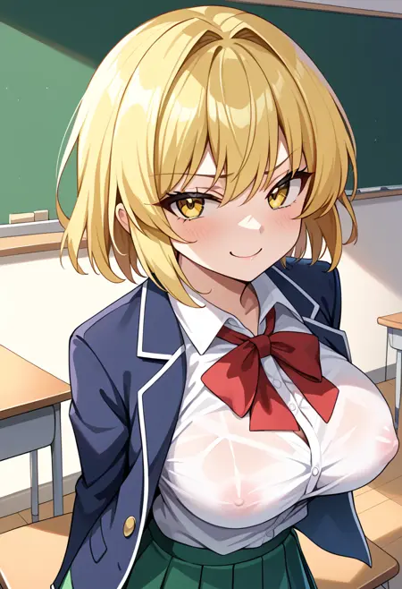 1girl, mugetsu, maid headdress with blue ribbon, yellow eyes, bow, maid, blonde hair, red ribbon, short hair, puffy sleeves, apron, blue dress