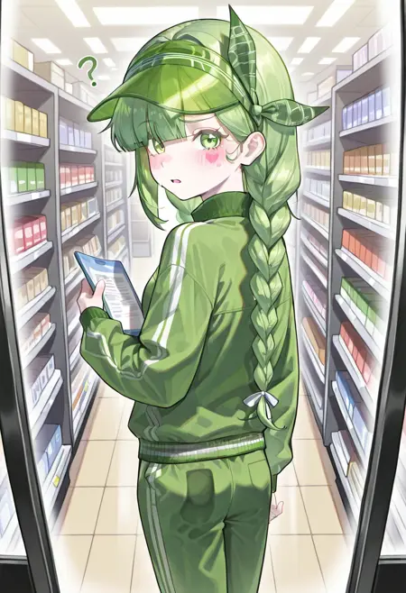 - 衣装プロンプト: ビジョーキャップ、緑色のヘッドウェア、緑色のジャケット、トラックジャケット、緑色のズボン、トラックパンツ、靴、スニーカー、白い靴履物 | 開いたジャケット、アームバンド、取り外し可能なカラー、緑色のブラ