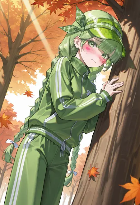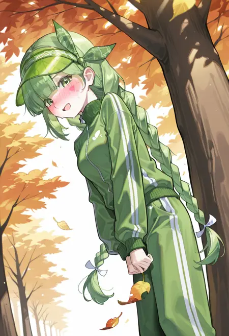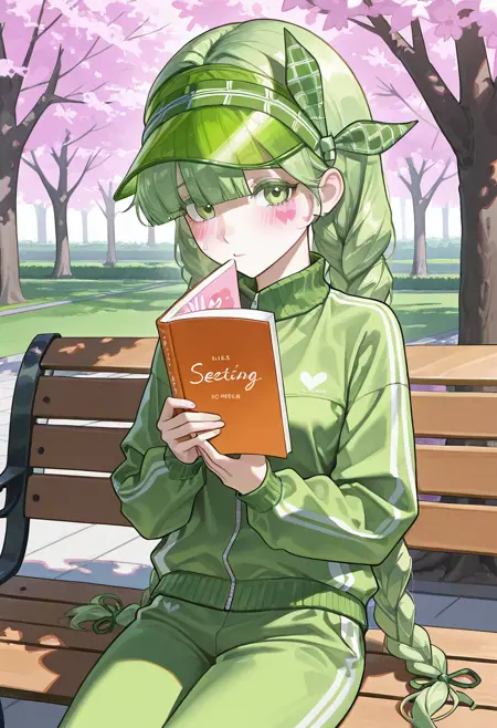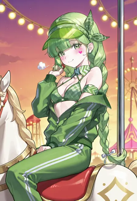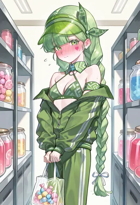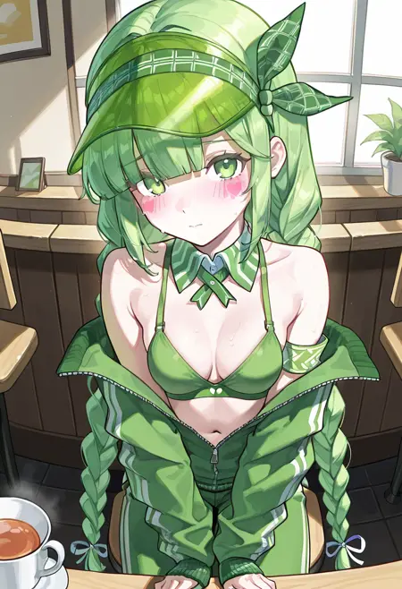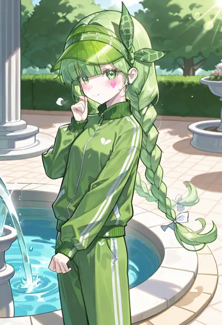 옷 프롬프트: 바이저 캡, 녹색 머리장식, 녹색 재킷, 트랙 재킷, 녹색 바지, 트랙 바지, 신발, 스니커즈, 흰색 신발 | 열린 재킷, 팔찌, 분리된 칼라, 녹색 브라
